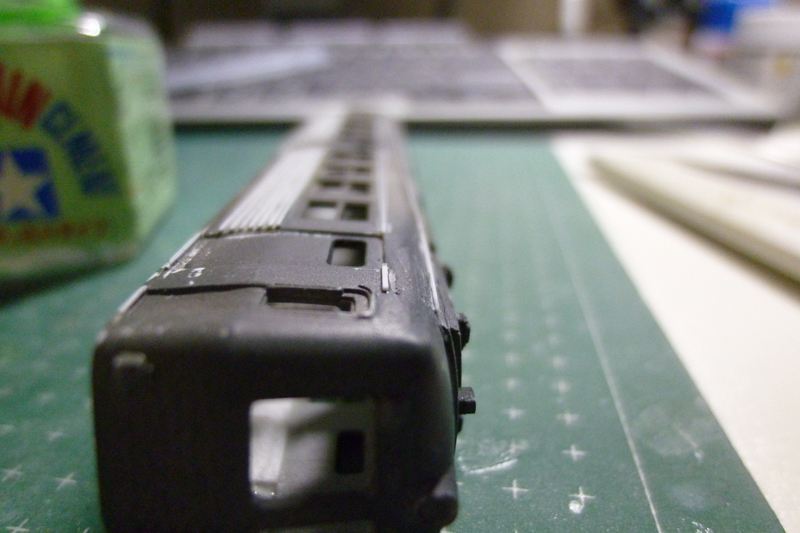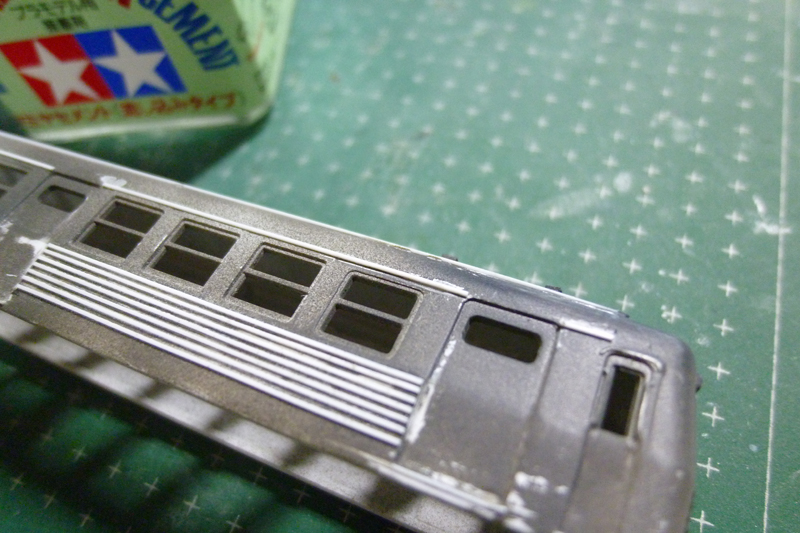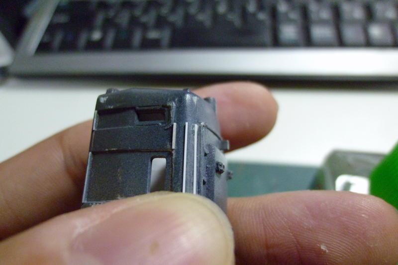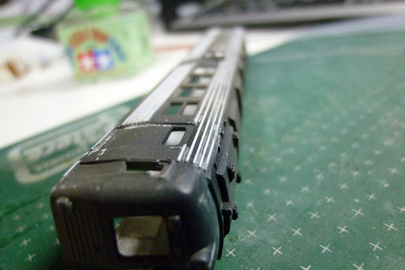 グレーに塗った車体と白のプラ棒というコントラストでだいぶ目立ちますが、上から塗ってしまえばそこまでは目立たない、というとこまで実証済み。