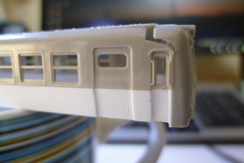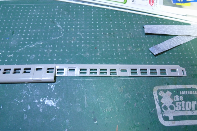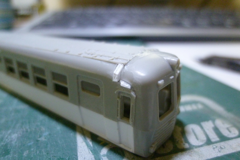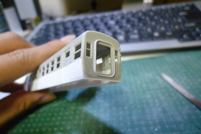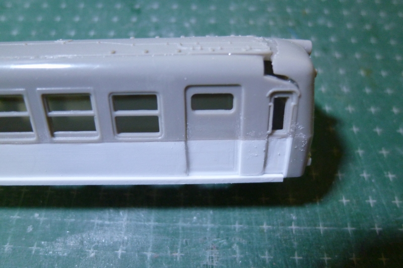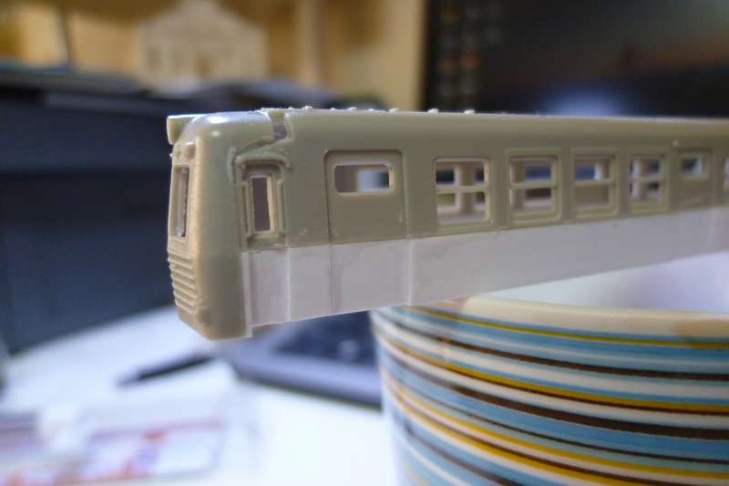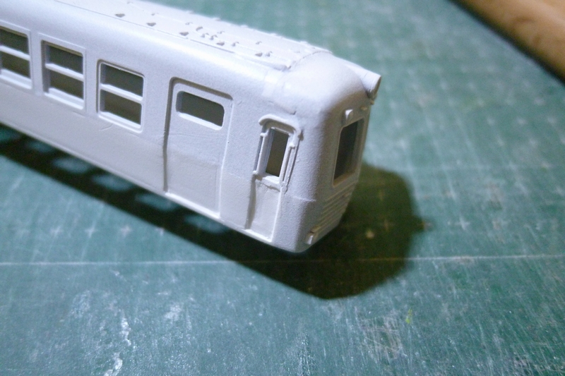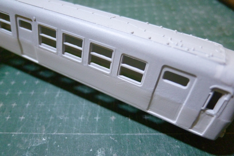 先ほど埋めた肩部分や乗務員扉の凹み(削りすぎ)、側面と後付けの裾の隙間・段差埋め、窓枠の段差の明確化…など修正作業が待ち受けています。