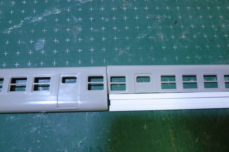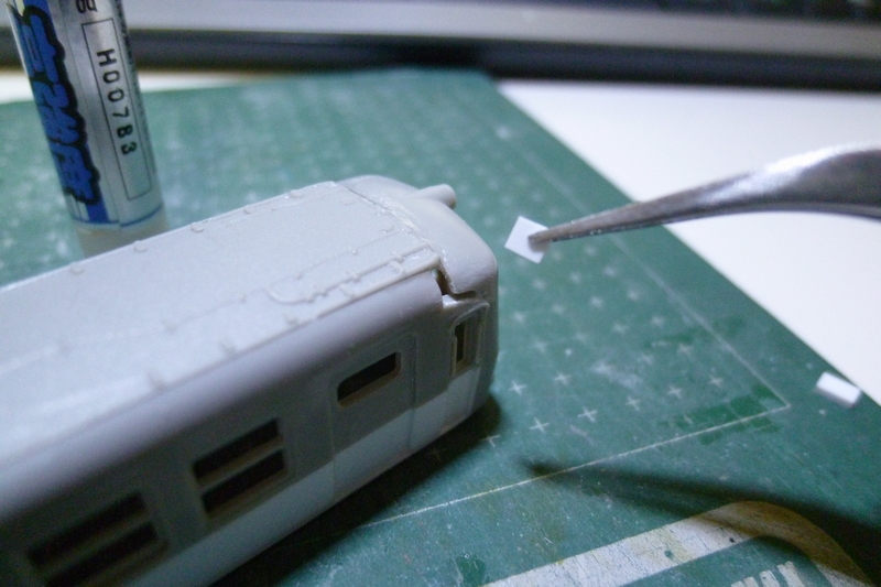 乗務員扉と先頭パーツの僅かな隙間には0.5mm厚のプラを接着、そこへ6mm高×3mm幅にしたプラ棒をはりつけます。