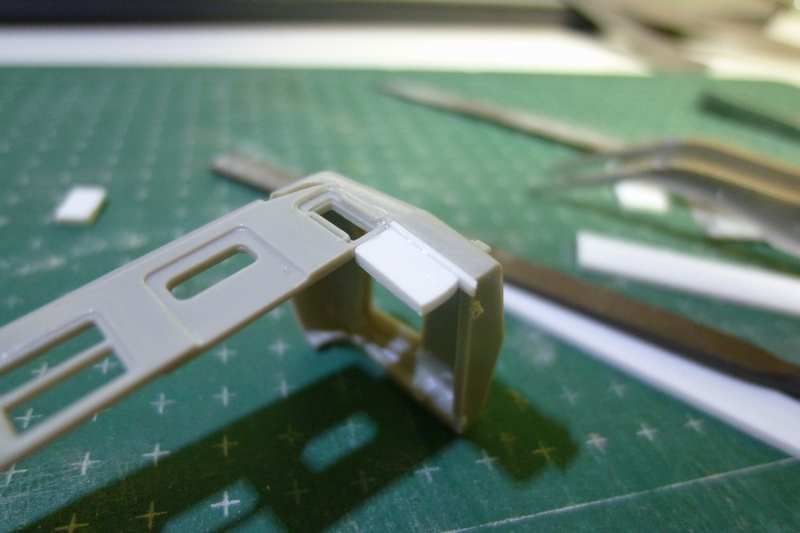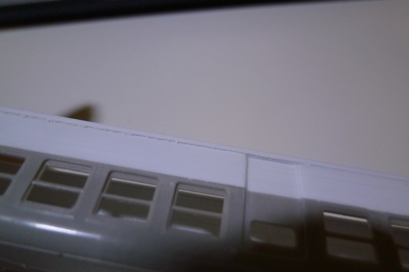 0.5mm厚×2.0mm幅のプラ棒を貼り付け、側面の高さに合わせて切削をしていきました。従来の丸い断面との隙間は瞬間接着剤で無理やり埋め込み。