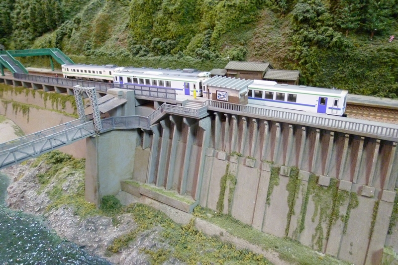 山陰本線風ということで餘部橋梁と保津峡駅(何度も実地調査をして完成させたそうです)が設置されており、先日発売されたDC181はまかぜやDF50、DD51などが似合いそうな風景です。