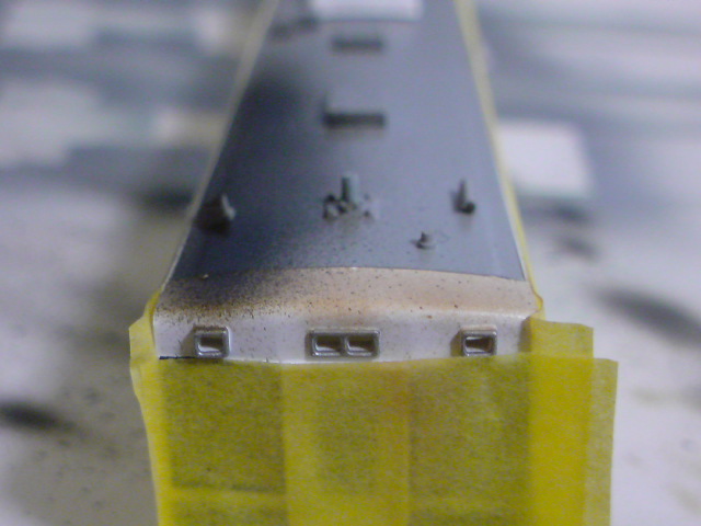また、車体に半光沢クリアーを吹く際には先頭車オデコの滑り止はきちっとマスキングして保護。ここのグレーにツヤがあっては滑り止にもならず「塗り分けの意味なし」になってしまいます。。