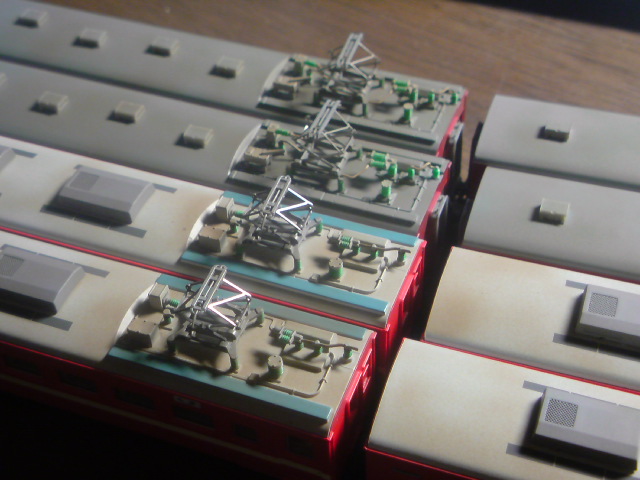 パンタ周りは全車共通で碍子などの機器を塗り分け、整形色だった製品状態に比べてメリハリをつけました。