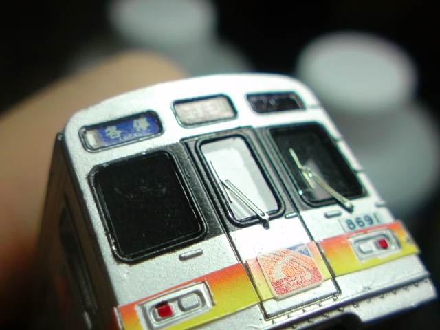 クロスポイントから発売されている8590系用の前面ガラス(2両分入り700円)をはめ込むだけです。窓の内側を多少カッターで削り取り、窓を入れます。また、ワイパーが再現されないので東急7200系用金属パーツから流用(運転台はIパーツ、貫通扉はHパーツ)します。