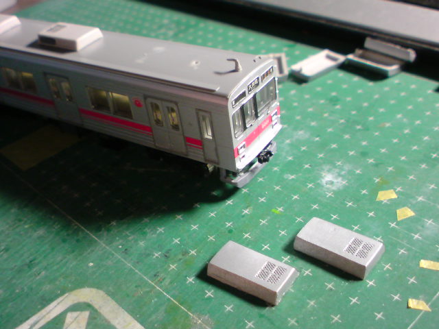 さて、その9001Fなのですが、5両編成20個のクーラーのうち8個がステンレスキセのクーラーに置き換えられているのです。従来までのGM製品だとこのクーラーがついてなく、また類似品も無かったため自作するしか方法がありませんでした。もちろん私の9001Fも自作クーラーが載っていました。
