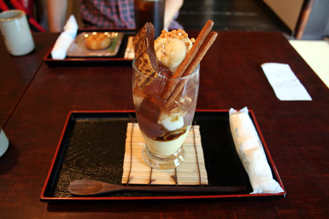京都の詩仙堂から一乗寺駅の道のりにある喫茶店で「中谷パフェ」(豆乳プリン・でっち羊羹・お茶寒天・とうふ羊羹・白玉・バニラアイス・抹茶ジェラートからなるパフェ、950円也)を食べたり…