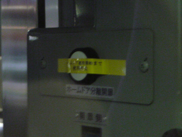 乗務員室のドアスイッチの部分に「ホームドア分離開扉」と書かれた新しいボタンが設置され、「ホームドア運用開始まで使用停止」という黄色のテープで封印がされています。