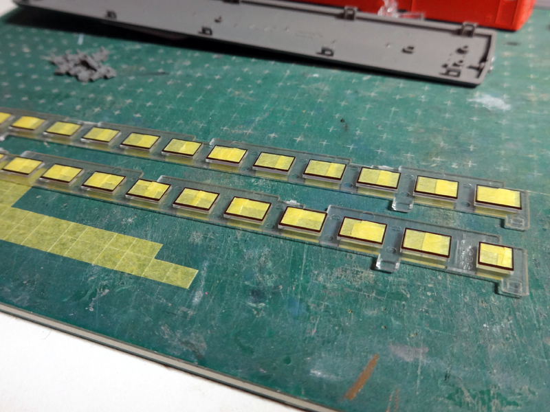 車体の塗装はもちろん、窓パーツ側へ印刷された窓枠も車体色(クリーム4号)に塗る必要があるため、マスキングをしてから塗装にて再現しています。