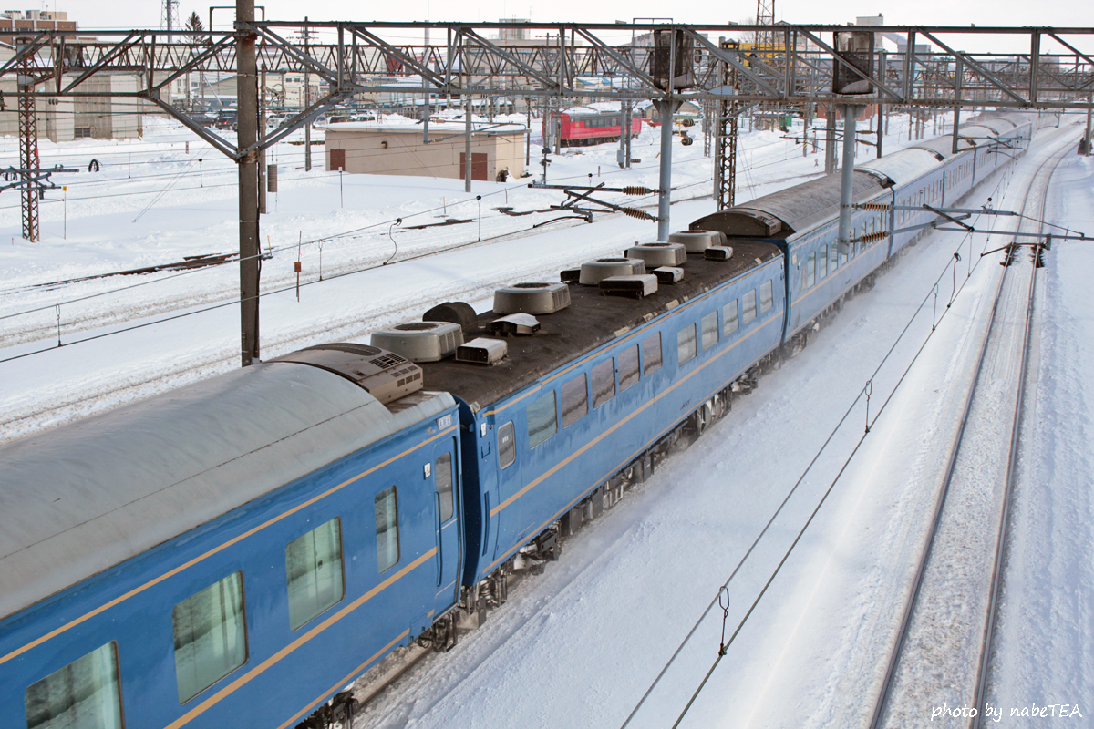 札幌~トマム間で運転された同列車(9414レ)はスシ24形3両をスハフ14で挟んだ5両、それを国鉄色のDD51が牽引するという、北斗星運行開始前でなければ実現できない編成。