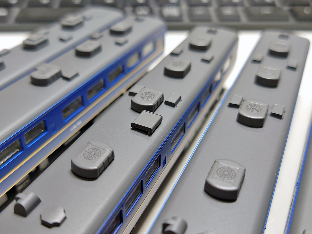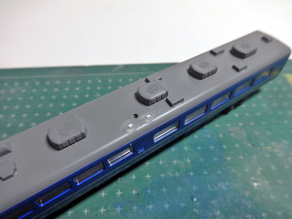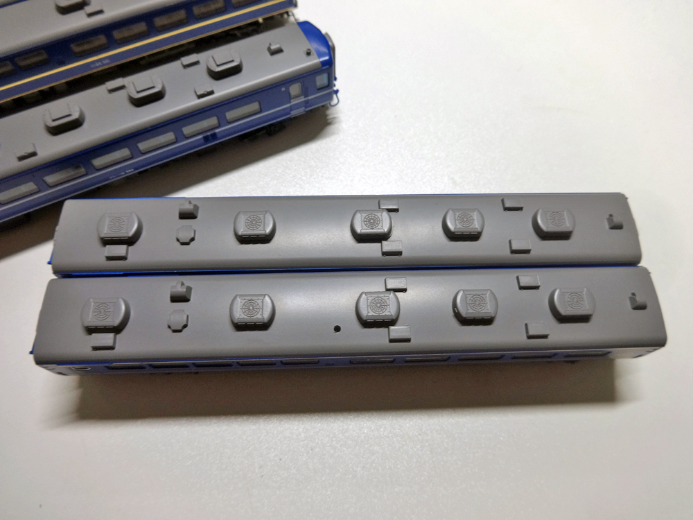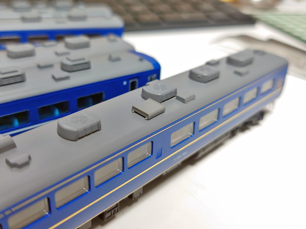 KATOの旧製品は501番として製品化されていますので、当然ながらベンチレーターは再現されていません。ベンチレーターが再現されているTOMIX製品などはそもそもバラシで入手することも困難ですし、3両繋げたスシ24がそれぞれメーカーが異なると、それこそ模型的に統一感が失われてしまうため、なんとかKATO製スシ24で揃えて再現をしたいところ…