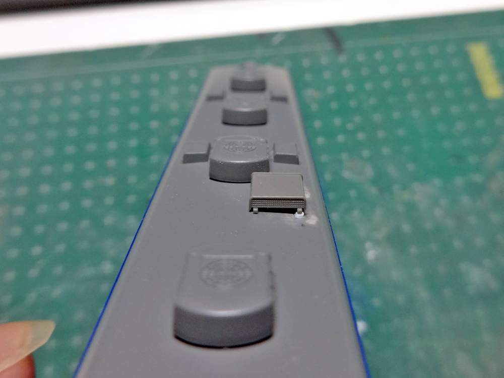 ベンチレーターの足位置に合わせてプラ棒から切り出した小片を接着し、水平を整え…
