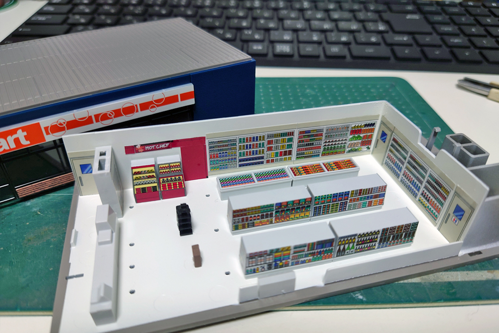 これまでのTOMIX製コンビニでは棚が床板にモールドされていたため、シールを貼るだけで内装は完成していました。