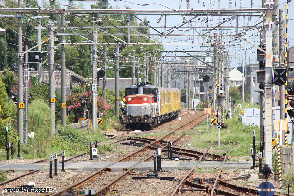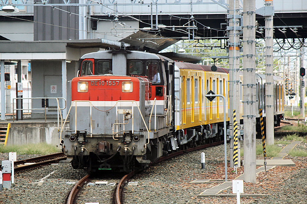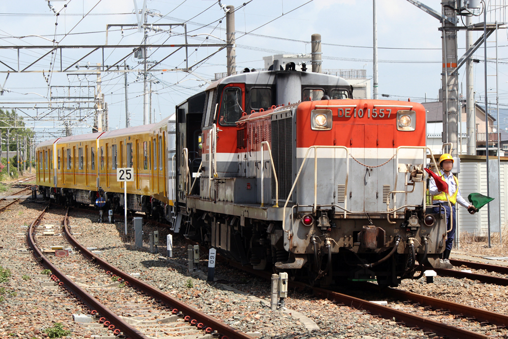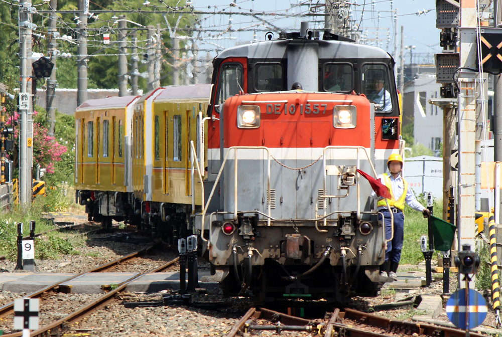 まずは日本車両への引込線(写真左手方向)からDE10-1557+ヨ8891+1106Fの編成で現れ、鈴与踏切の手前で停車。
