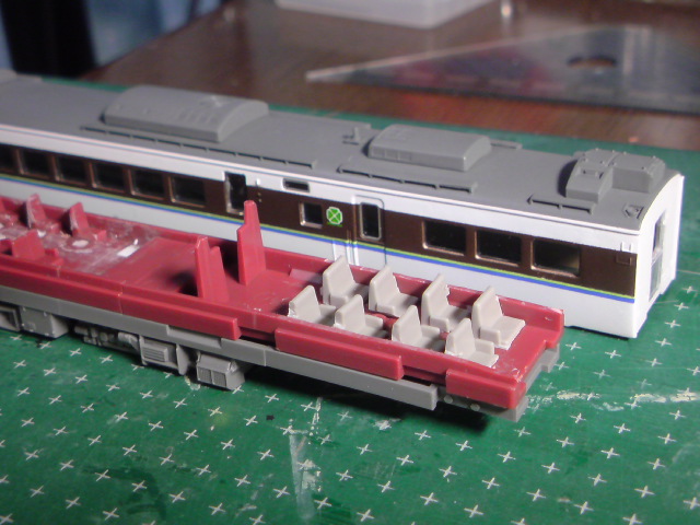 これでボディと床下をパチッとはめて完成…だったのですが悪い癖が出て、気づけば車販準備室撤去・普通車部分として座席を16席(2+2で4列)ジャンク箱から調達、グリーン室部分は1列削減(8列から1列削減して7列に、減らされた場所は喫煙スペースに)と座席の2+1配置への変更を始めてしまいました。