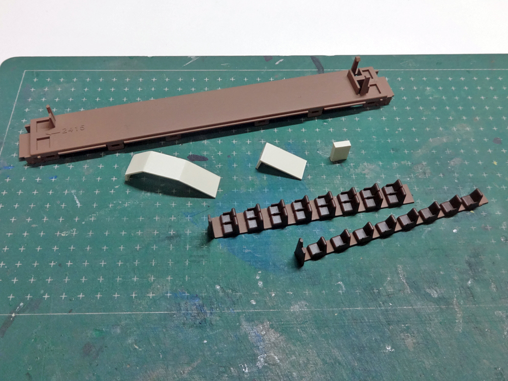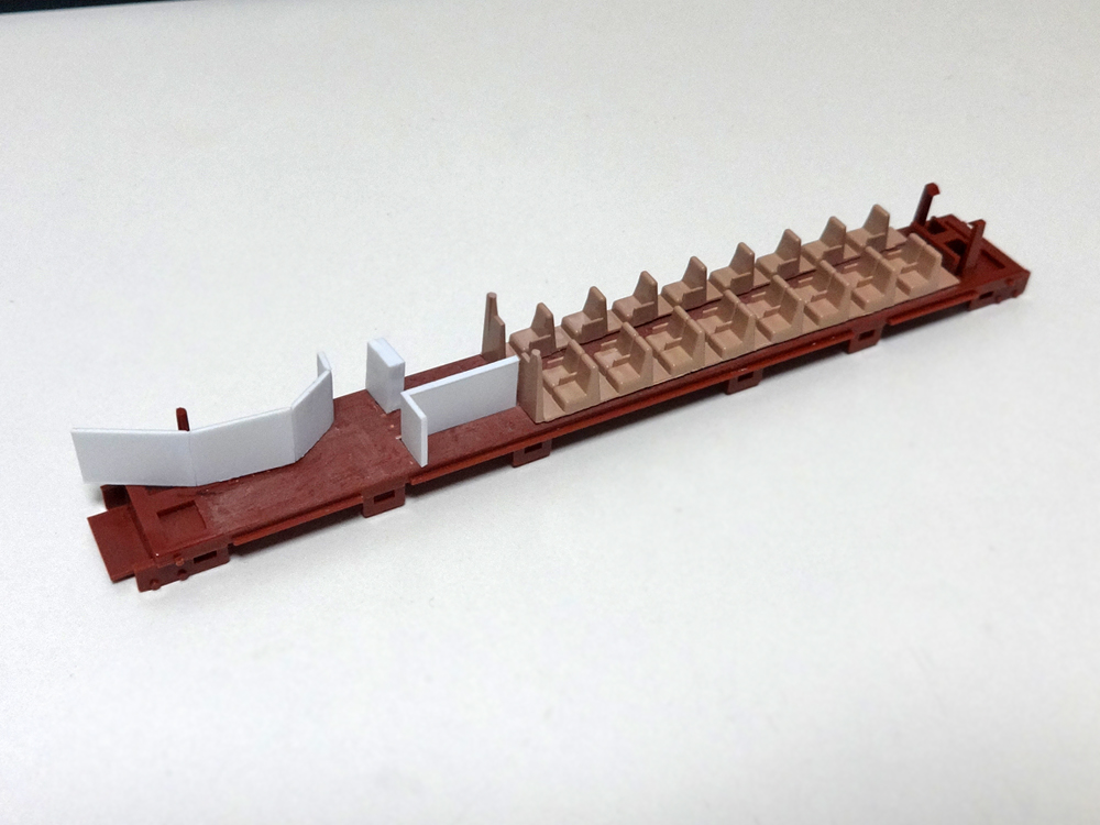 M車ゆえに床面自体が高くなっているので、客室に向かうスロープこそ再現できませんが、壁、座席、床板…などパーツ毎に塗装し、組み立てていきます。