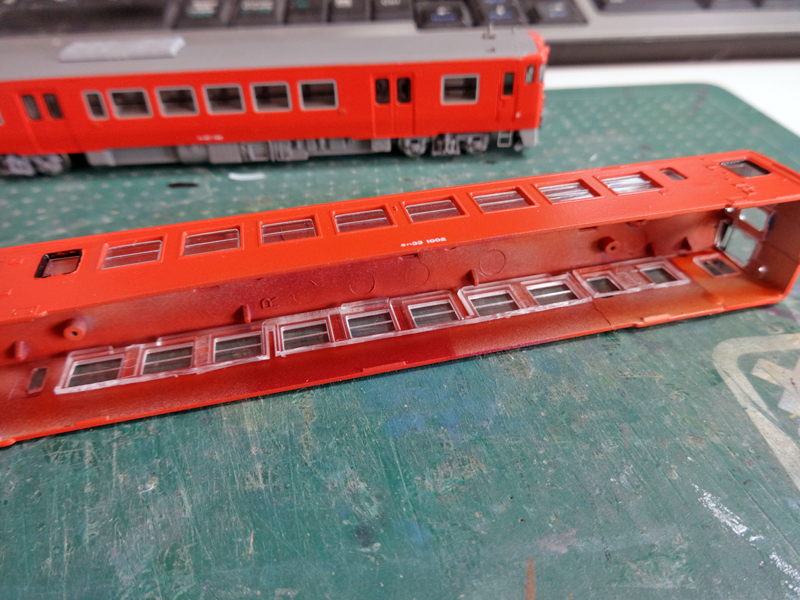 塗装完了後は種車から外していた窓ガラスをはめ込んでいきます。