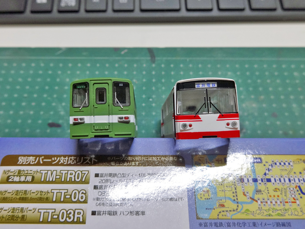 富井電鉄のレールバスを2個イチし、車体を延長しています。