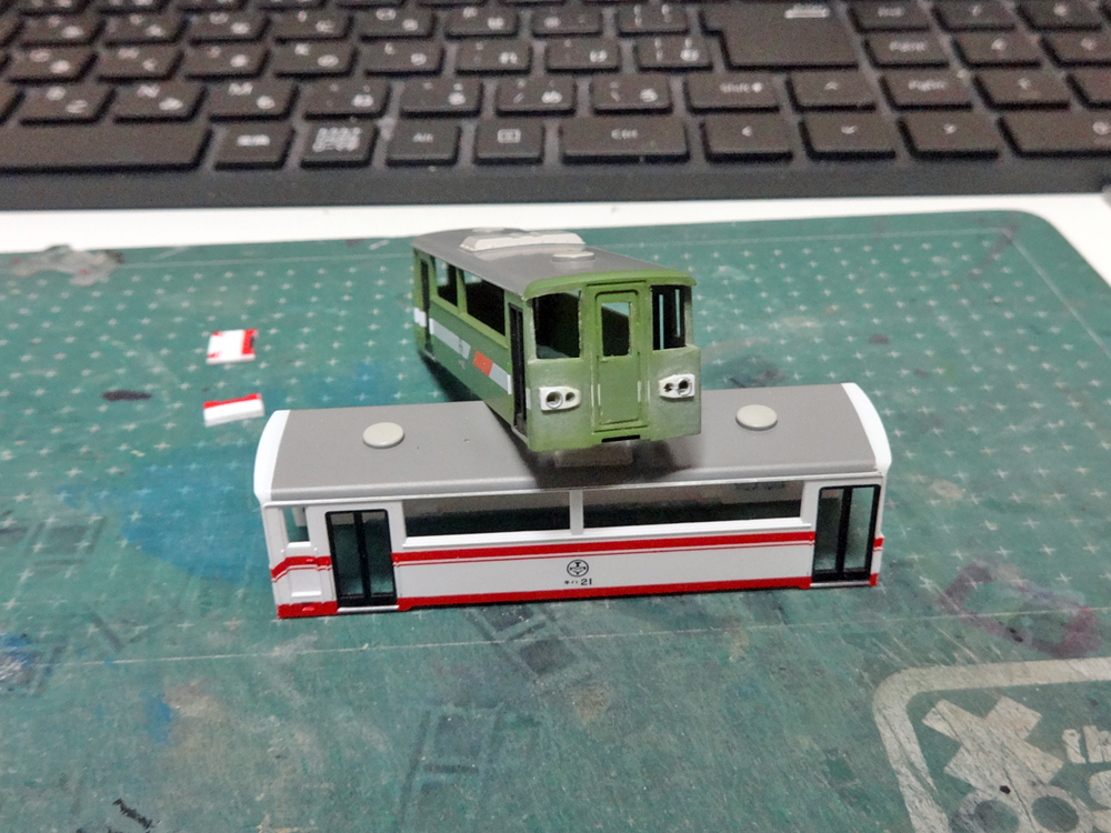今回は緑車体をベースに赤帯車体の中間部を使って車体長延長を行ってみました。