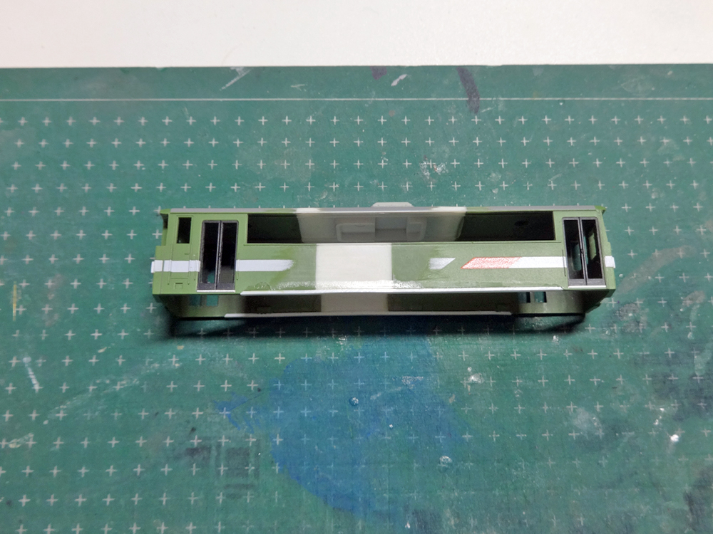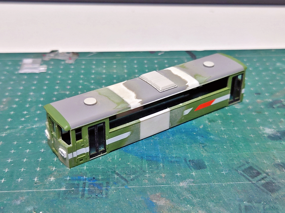 前面は緑車体のライトケースを削り落とし、赤帯車体のライトケースを移植。