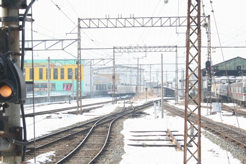 その後、T1編成は湯田中方本線へ一旦出てから須坂駅5番線(ホームは使用中止中)へ入線。