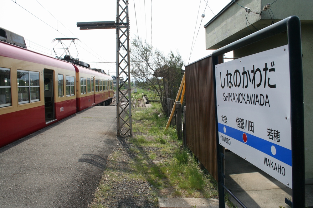 そんなわけで最後は信濃川田駅の駅名表と2000系のツーショット。