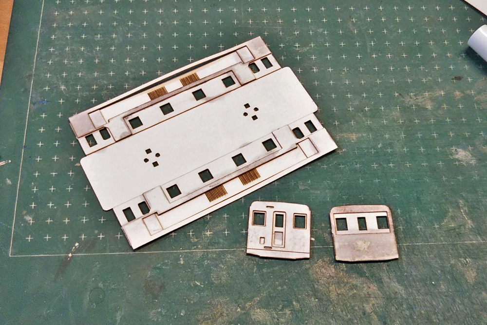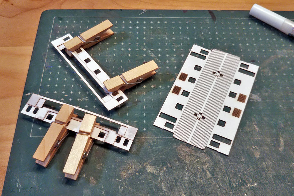 まずは説明書を読みつつ、瞬間接着剤にて2枚構成の内貼りと3枚構成の妻板をそれぞれ部材ごとに接着し、箱組みに備えていきます。