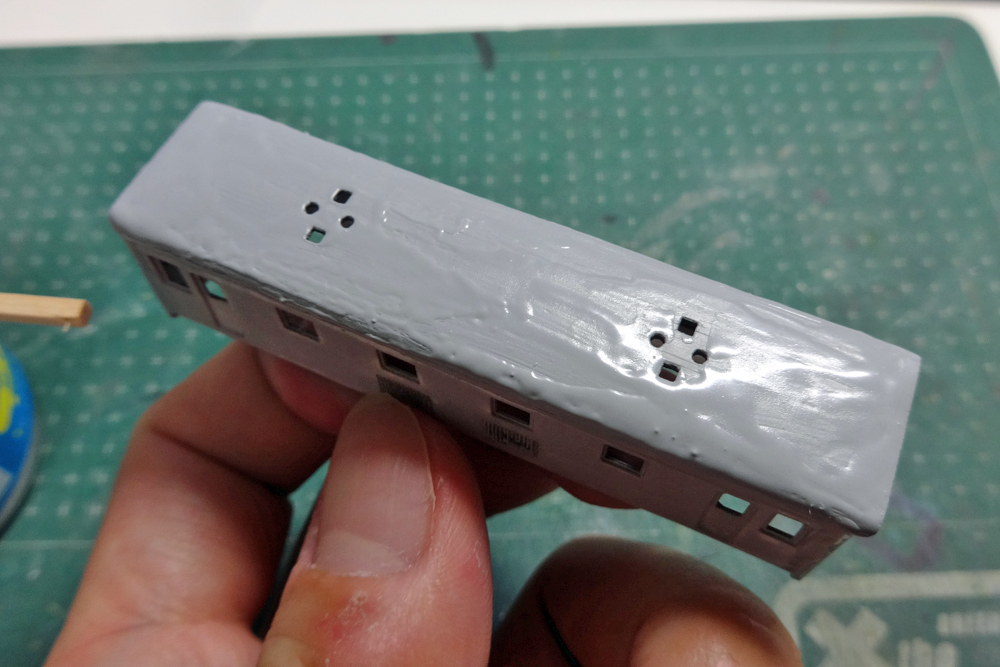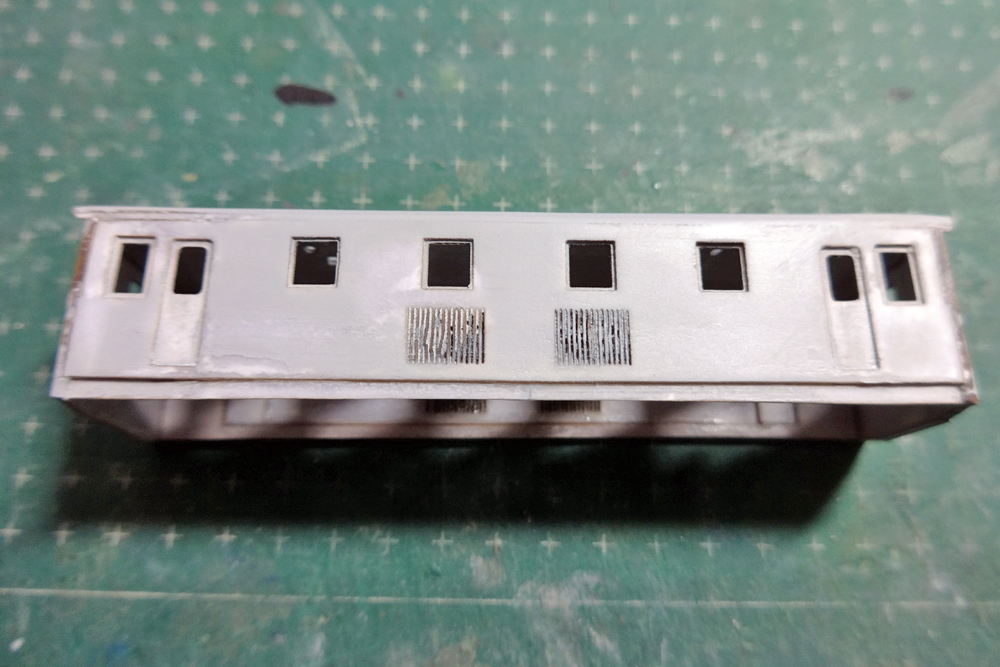 というわけで思い切ってここを切除し、ルーバーを新設。ついでにED5001実車に合わせて横スリットのルーバーに作り替えてみることにしました。