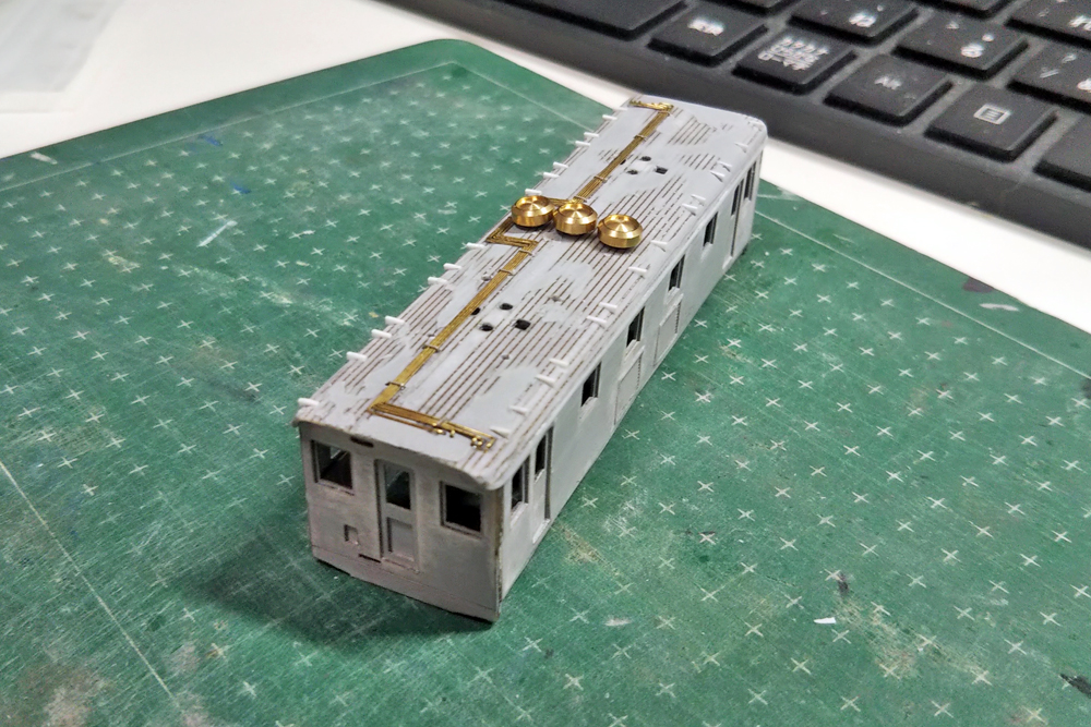 車体中央のベンチレーターはキッチンさんの「小型グロベンB(傾斜縁)」。103系あたりのグロベンを流用しようかとも思ったのですが、サイズが大きすぎてNG。