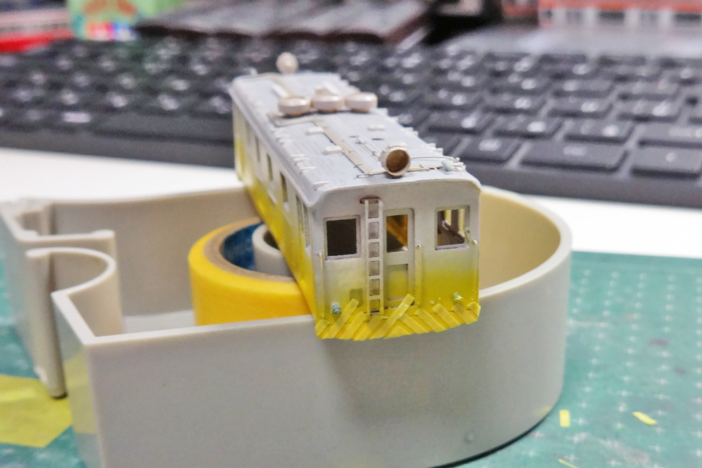 まずはピュアイエローで前面・側面の裾を塗りマスキング。ちょっと欠けたりもありますがなんとかゼブラになりました。