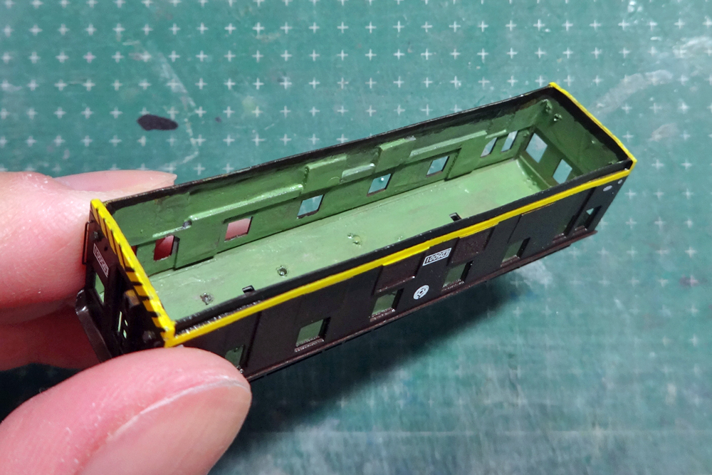 動力を組み込む前に車体内側を明緑色にて塗装。