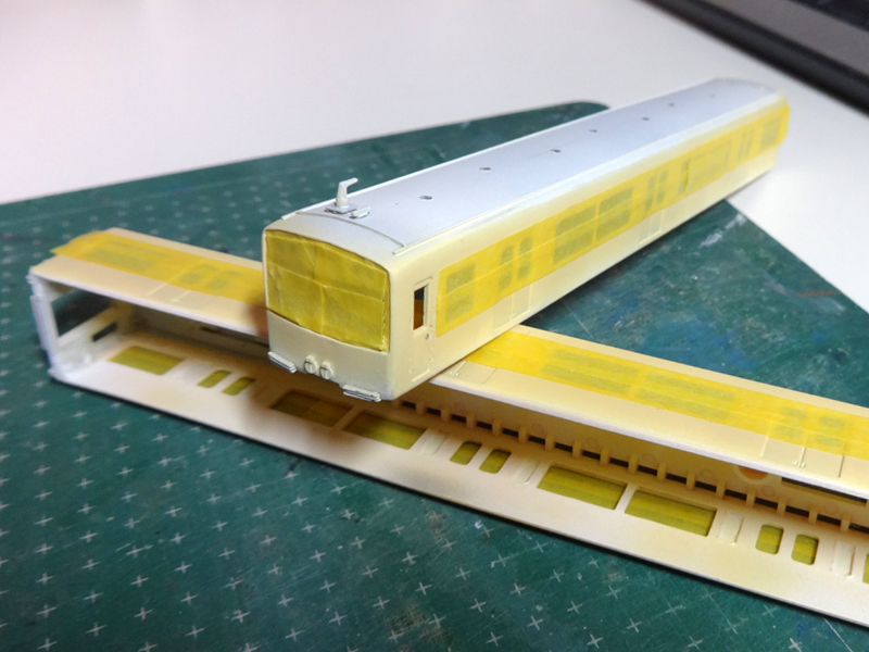 まずは自家調合の「長電アイボリー」(GM4番+28番+白を調合)を1色目に塗り、後から赤を重ねる方向で進めていきます。