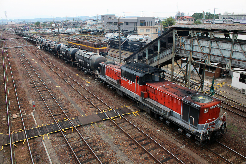 跨線橋の上から撮影すると、旧ホームを挟んで三岐の電気機関車がいるのも見られました。