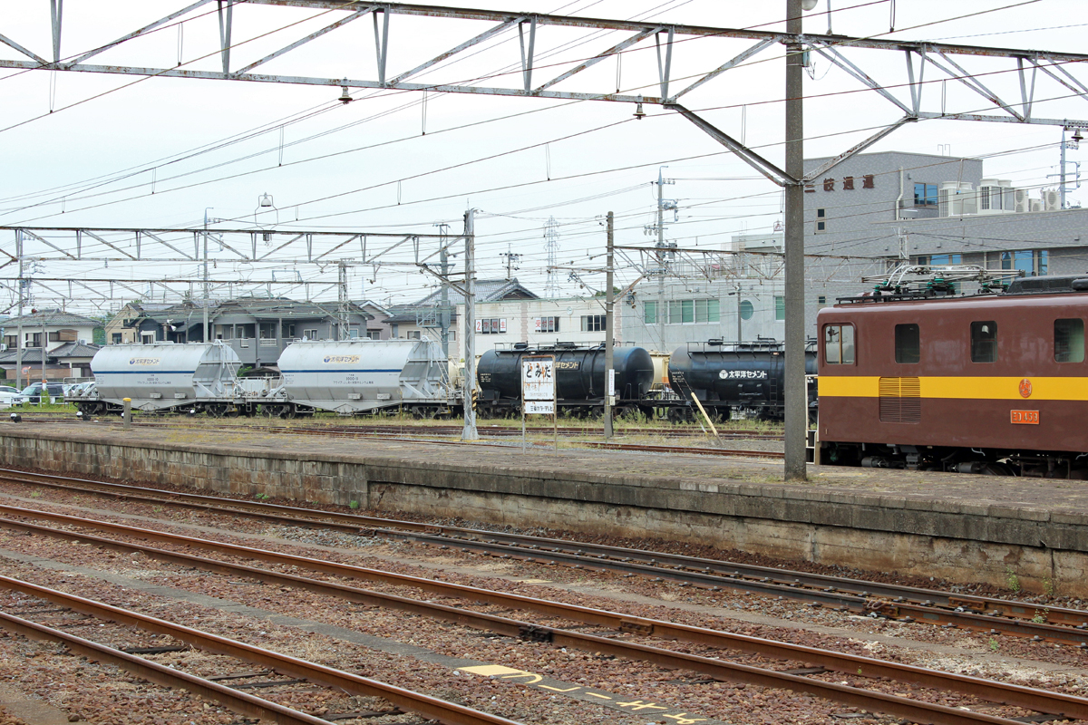 富田駅でDD51牽引のセメント列車を発見、慌てて下車しました。