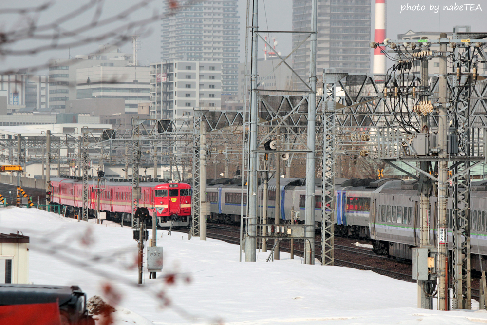 その後ろを千歳線からの789系快速エアポートが追い上げ、前からはキハ183系特急北斗が駆け下りて来る(さらにその後ろ函館本線にはキハ201も)。