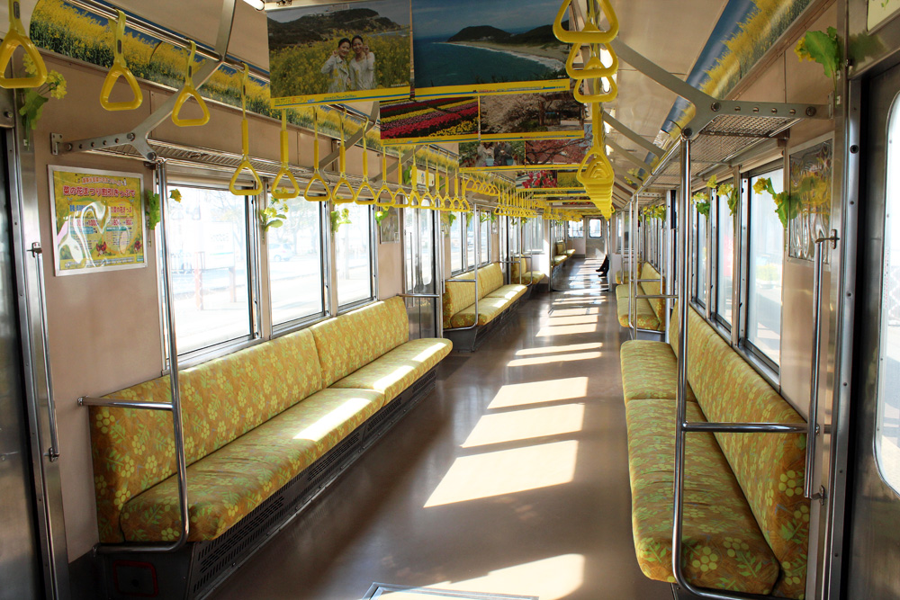 窓と窓の間には菜の花の造花が飾られ、中吊りは全て渥美半島や菜の花にちなんだ写真ポスターに帰られているなどかなり本腰が入っています。