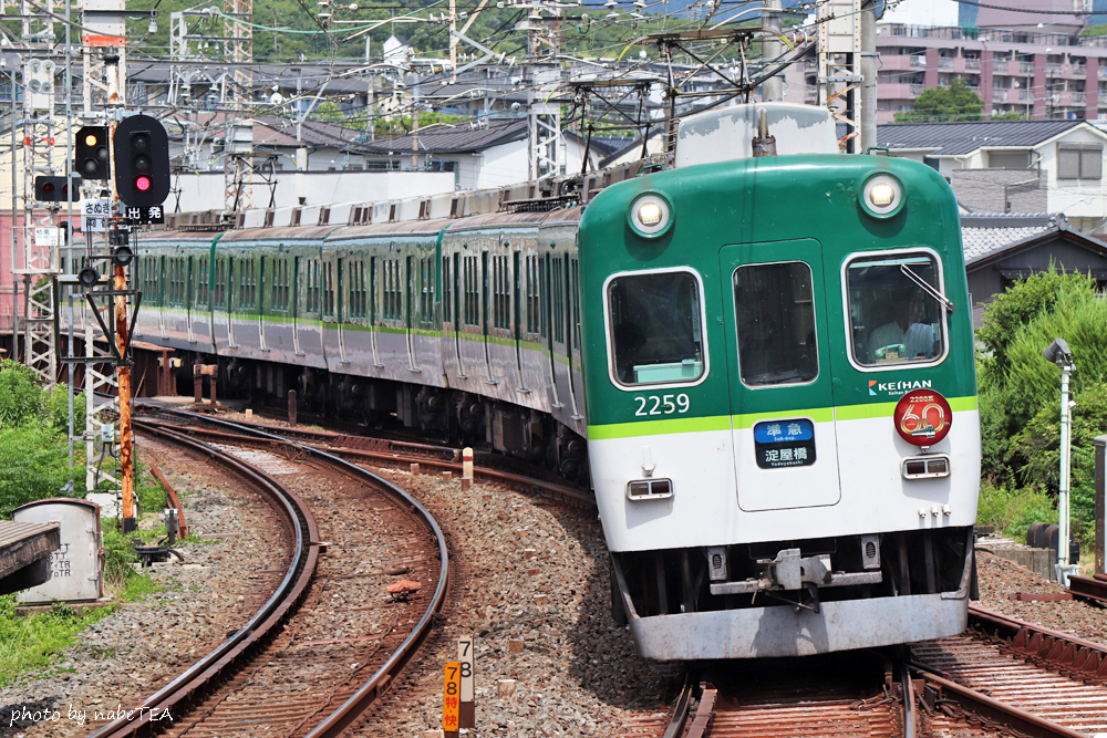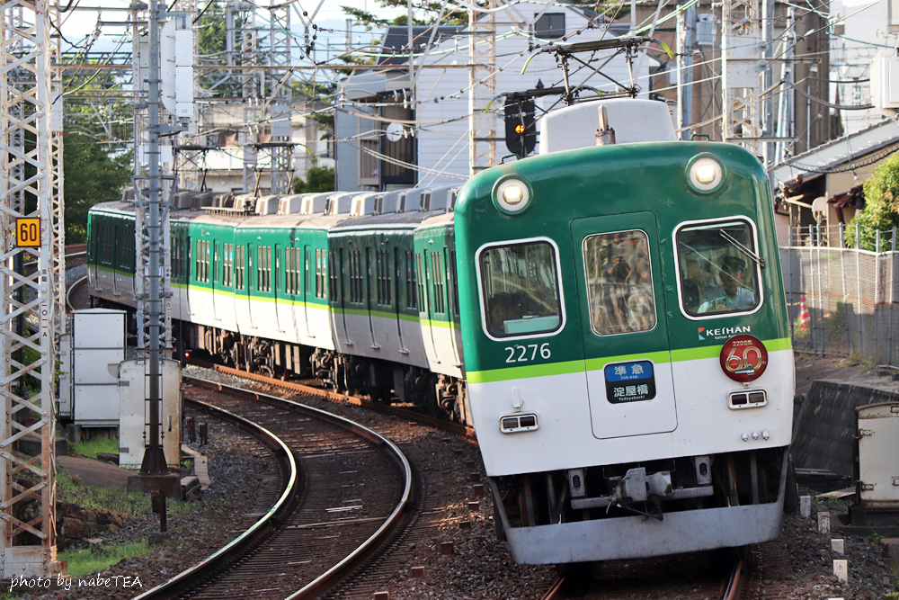 昼食がてら中書島へ移動したところ、到着後早々に2209-⑦-2259編成が来たのであまり待つことなくあっさりと新塗装+60周年副標の組み合わせを回収。