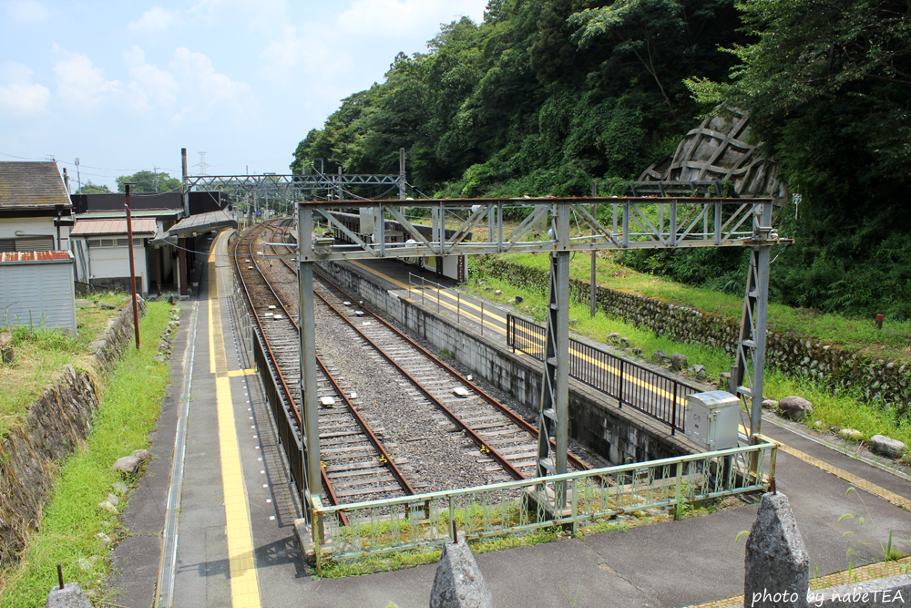 一段高い所から駅構内を見下ろせる道路があり、このアングルで眺めているとどうしても上田電鉄の別所温泉駅が彷彿とされます。
