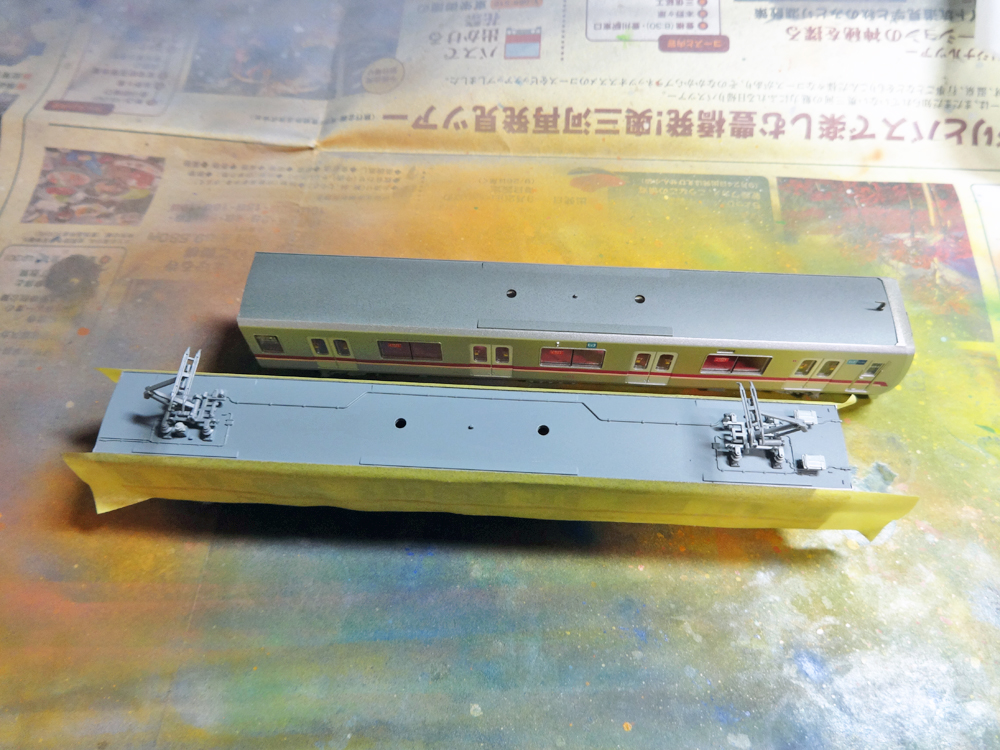 車体側面は肩部までをマスキングし、屋根だけ汚していきます。