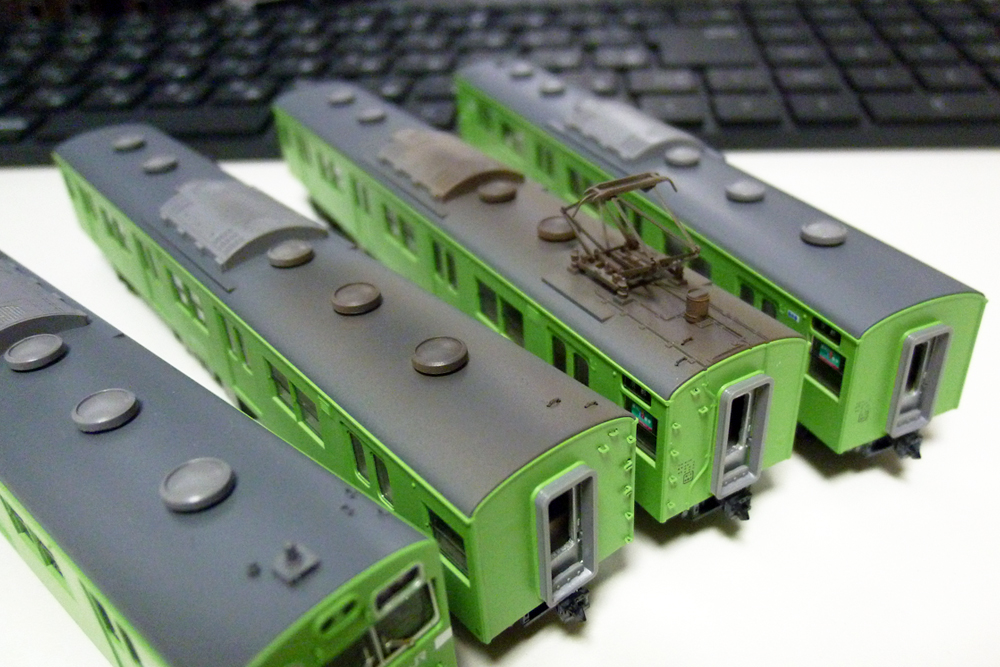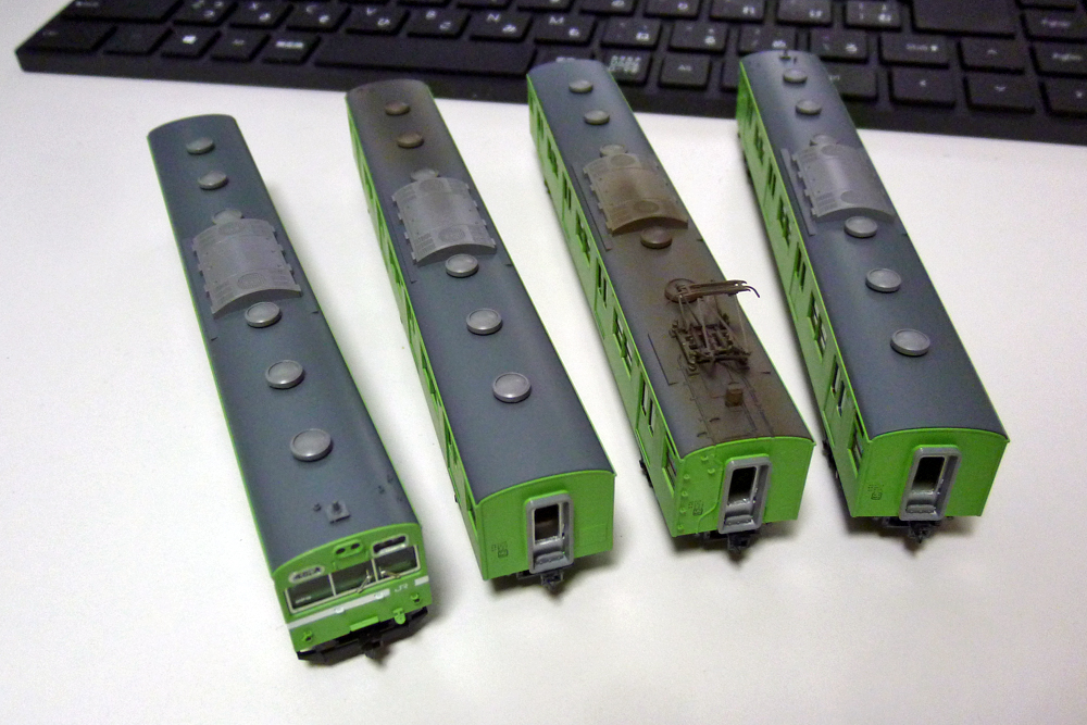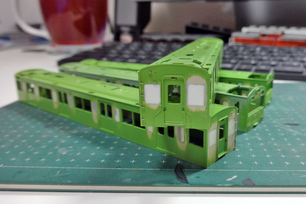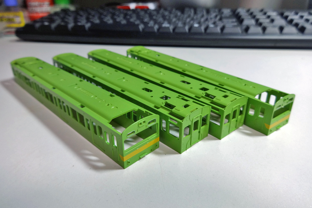 塗装の方はと言いますと、車体はGM黄緑6号、前面帯はアルティメットホワイト、屋根は自家調合の国鉄屋根用ダークグレー(GM35番を基本として若干暗めに調色)で塗装。