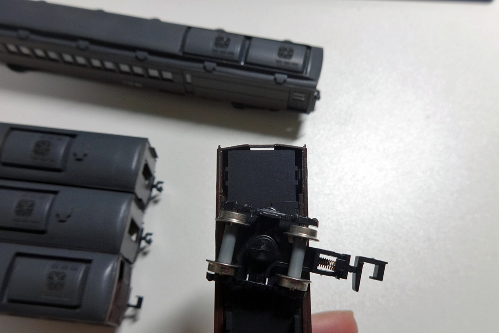 上の写真だと上から1・2両目が台車付属のアーノルトカプラーの飛び出方、3・4両目がボディマウントTN(0374)、5両目がパーツボックスから発掘した腕の長いアーノルトカプラーを取り付けた状態です。
