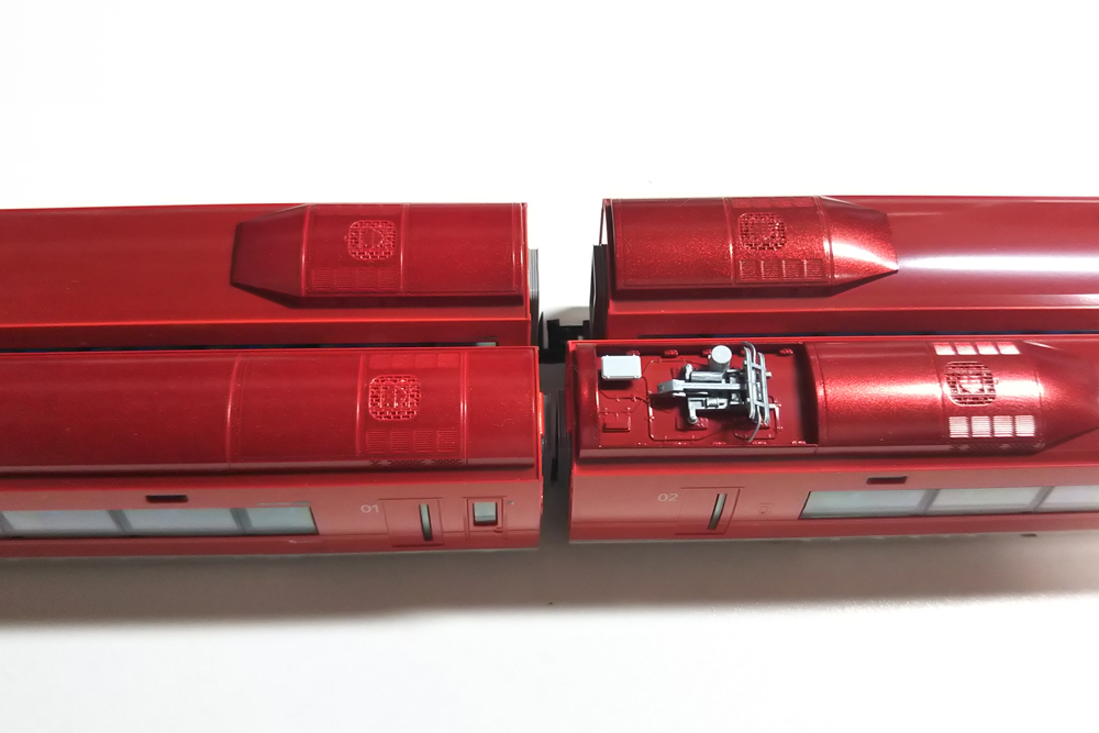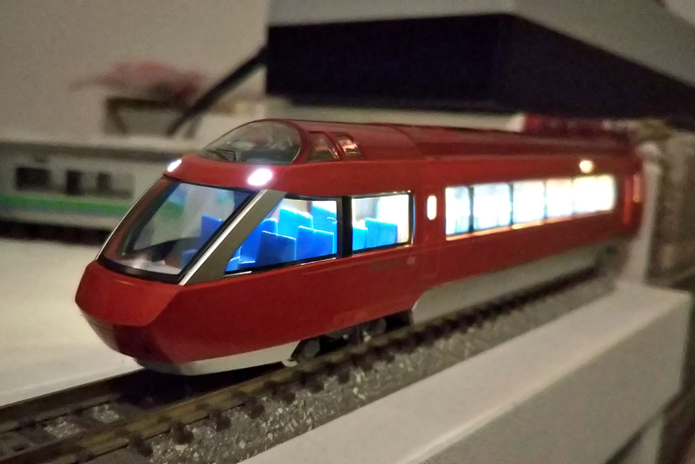 先頭車の展望室部分には元から室内灯が入っていますので、前面窓から室内灯が見えてしまう事がありません。