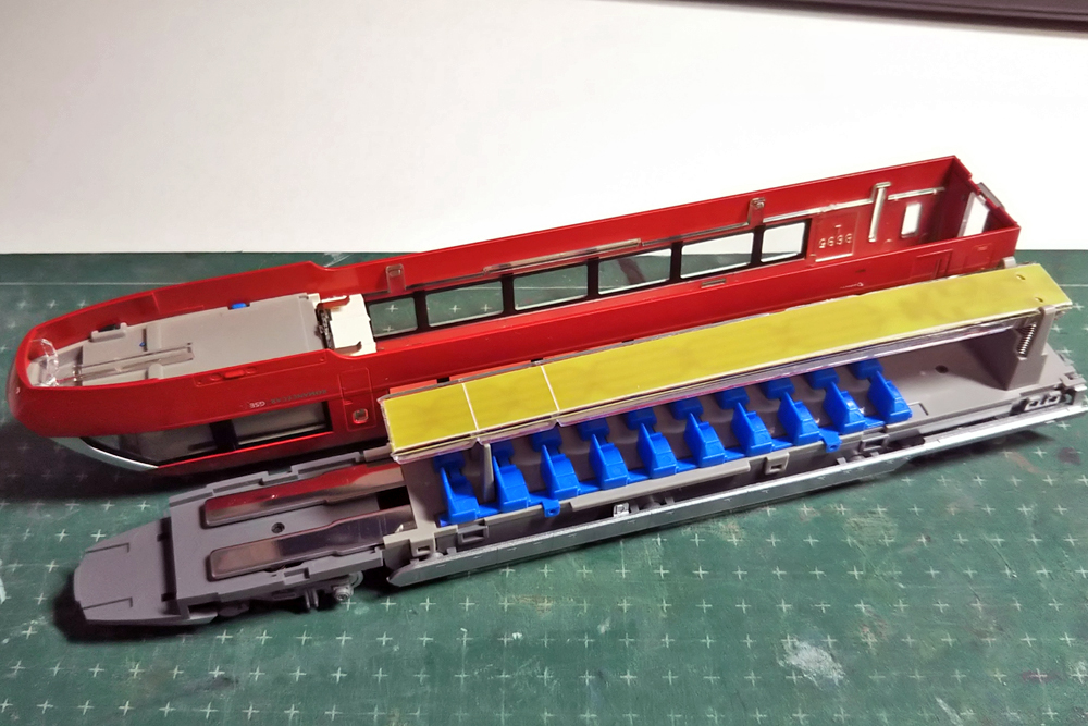 ここまでやると座席が全てプラ成形色の青色のままなのが気になりますが、実車のシート生地模様を再現するにはステッカーを作るほかなさそうです。塗装ではちょっと無理ですね(苦笑