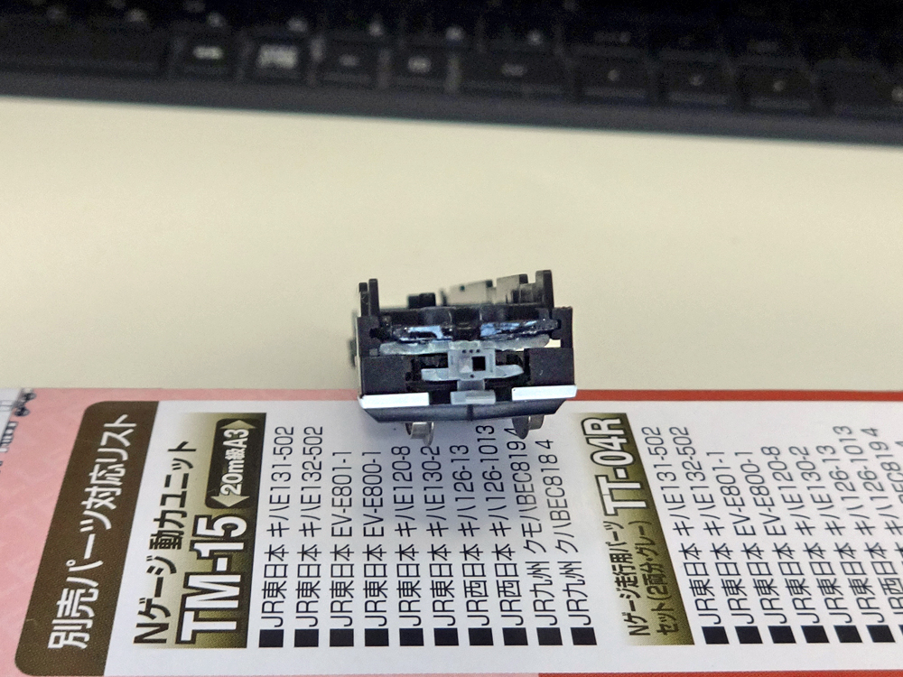 いつもならM1.4の小ねじも使用するのですが、T車1両でキハ110系にぶら下がるだけなので、簡易的に接着剤での固定のみで製作してみました。
