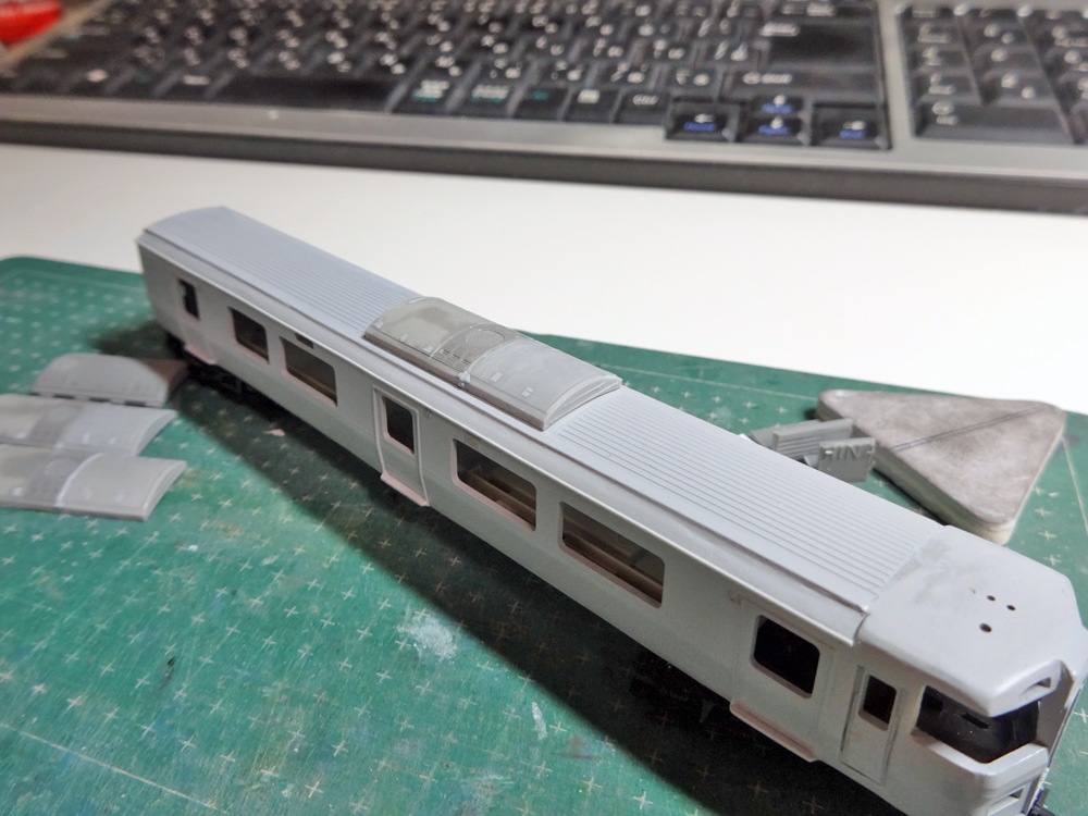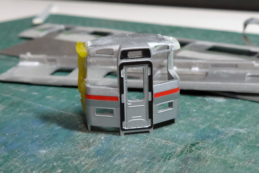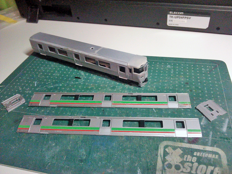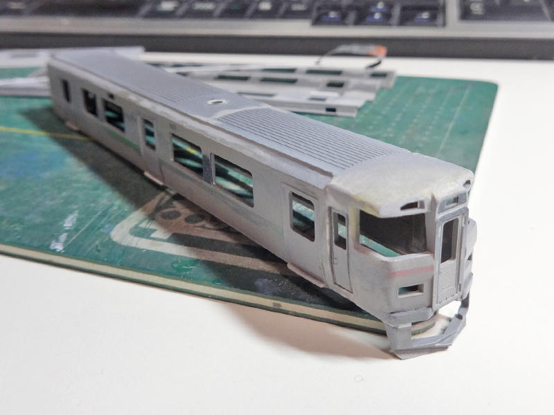 "JR北海道733系製作記"カテゴリーの記事一覧 733系製作記その9~完成編・試運転 前回記事で書いた通り塗装開始から完成までほとんど写真がないため、いきなり完成写真に。 ▲レトモ様3番線にて つづきはこちら 733系製作記その8~クーラー製作と塗装 Twitterの方では完成写真を上げてしまいましたが…連休も終わり自宅へ戻りましたので、製作記の続きです。…といっても最後の方は一気に作業を進めてしまい、毎度のごとく写真少なめです。 ▲位置合わせの時に既に写真をアップしていますね(苦笑 つづきはこちら 733系製作記その7~何歩戻る? 733系の製作は最終目標地点を3000番代⇒0番代⇒1000番代と変遷を遂げ、進行しています。 そろそろ塗装に入れるか…というところでふと気づいてしまった点。そう、番代によりクーラーの位置が違うのです。非常に「今更」感たっぷりの気付き、もとい大チョンボなのですが… つづきはこちら 733系製作記その6~M車の屋根製作 さて、久々にこの記事の続編です。前回記事から相当の時間が経ってしまっていますが、まだまだ完成はしておりません。。とはいえそのまま腐らせるつもりもなく、チョビチョビと作業を続けています。今回はM1車…もといM車の製作の続きです。 ▲ビード部分をTc車に奪われたM車屋根の切れ端を使用します。 つづきはこちら 733系製作記その5~M1車着手 先頭車クハ733-3100に先が見えてきましたので、2号車となるM1車=モハ733-3100に着手していきます。クハ733同様、妻と側の接合部に刃を入れて車体を4枚に下ろします。まずはこの状態で下拵えをしていきましょう。 つづきはこちら 733系製作記その4~Tc1車仕上げ 引き続き、クハ733-3100を作っています。 なんと前回記事から2か月も経ってしまい、私自身がビックリ。運転会ネタや小ネタ等を作っていて完全に牛歩戦術になっていますが、733系も少しずつ進めています。前回記事以降、パテを盛ってはヤスり、サフを吹いてはヤスりということを繰り返していましたが、なんとか"これでいいかな"という所まで来ました。 つづきはこちら 733系製作記その3~頭の製作と、接合 さて、今後は頭の整形を行っていきます。 つづきはこちら 733系製作記その2~続・側板の加工 4枚おろしになった731系を733系のごとく仕上げていきます。前回に引き続いて側板の加工を進めていきます。 ▲札幌駅に入線する733系B-118編成 つづきはこちら