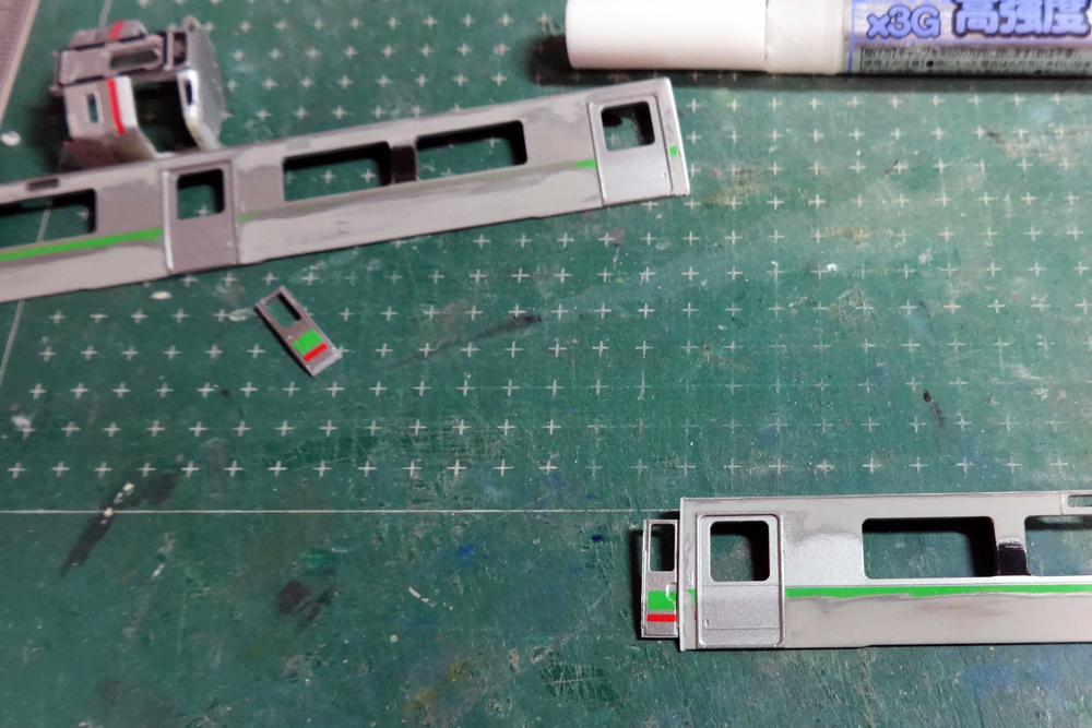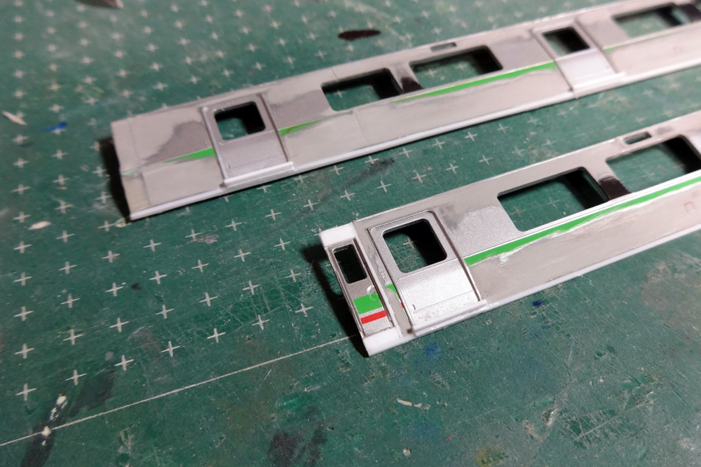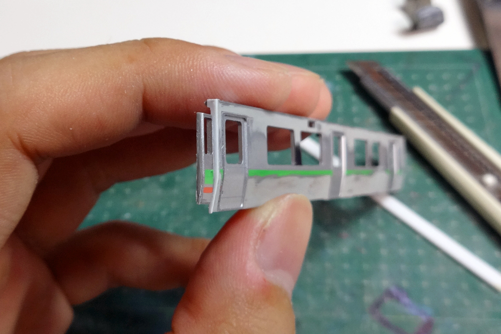 位置が決まったら幕板と裾をプラ板で切り継いで、乗務員扉部分の側板を再生。