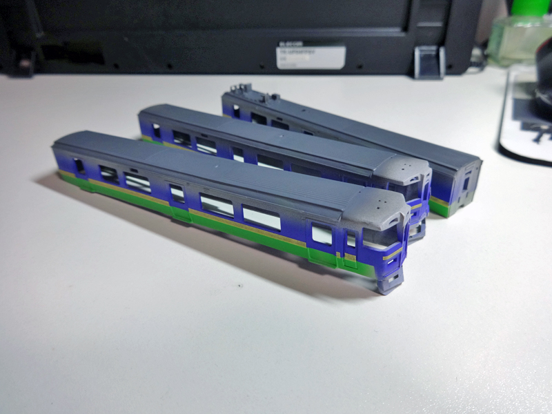 さらに銀色はその素材により車体・前頭部・扉と塗り分けますので、塗ってはマスキング、塗ってはマスキングを繰り返していきます。