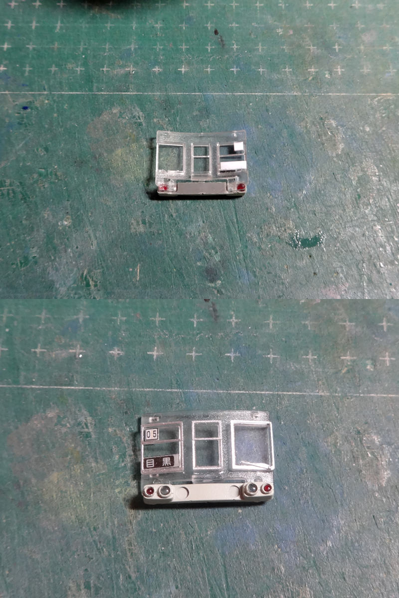 前面に掲出される運行番号・行先表示は「窓の内側」に機器が設置されていますから、せっかくなら模型もそうしたいもの。