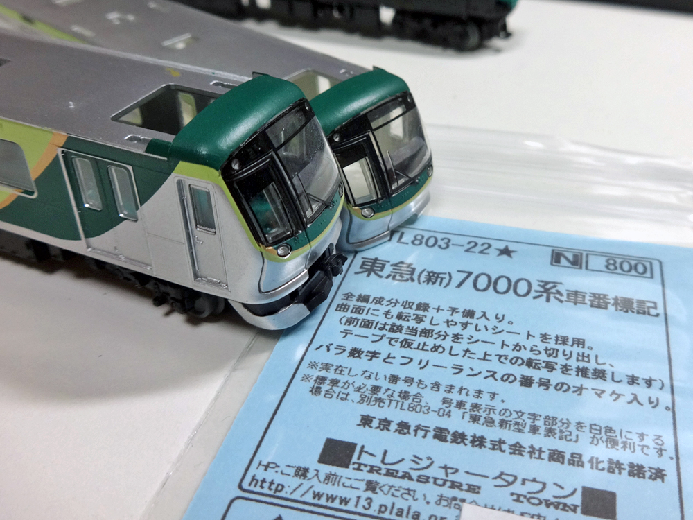 トレジャータウンさんがそのものズバリ「TL803-22 東急(新)7000系車番標記」というインレタを出されていますので、今回はこれを使用。