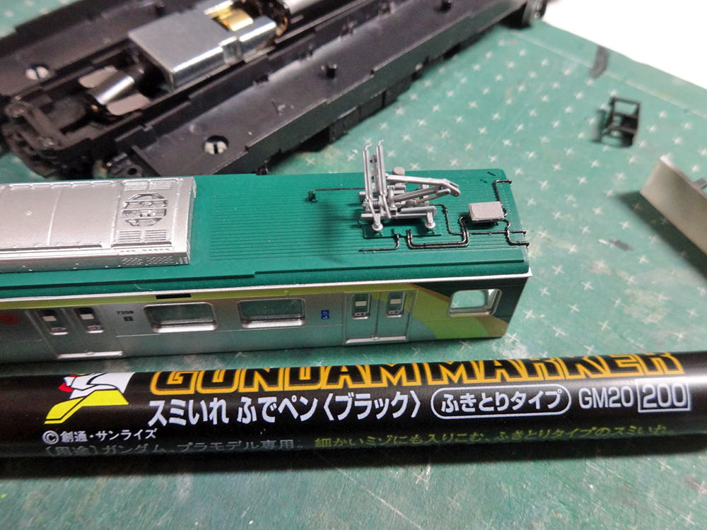 パンタの先端に、蛍光グリーン(ミスターカラー#175あたり)を差していただければと思います。