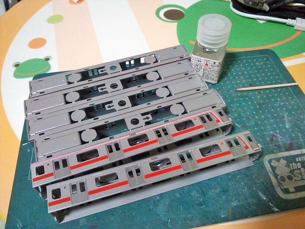 帯を塗り重ねる部分はいいのですが、転落防止の黄色縦帯や車番を落とす際、少し擦り過ぎると下地のシルバーも一緒に剥げてしまいます。